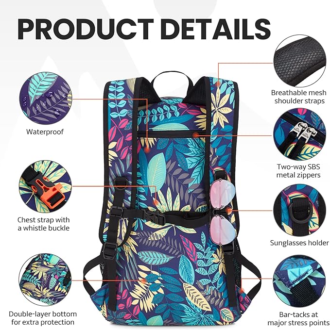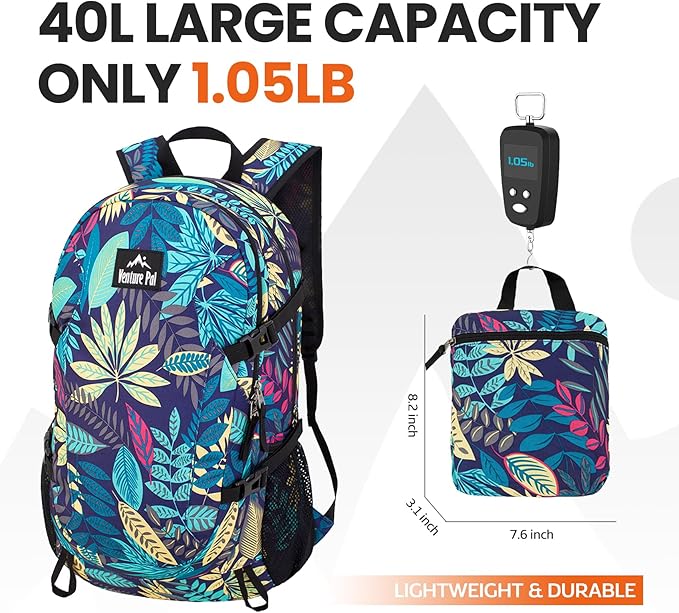 - Compact and Comfortable: It weighs only 1 pounds, can easily fold into its own pocket for storage,and unfold it when you need it. Perfect all-purpose carrying bag for traveling , easily fit in the luggage. Breathable mesh shoulder straps with plentiful sponge padding help relieve the stress from your shoulder. The chest clip with a whistle buckle work perfectly to distribute the pack’s weight and keep it steady and centered. A must have for sports , hiking and camping