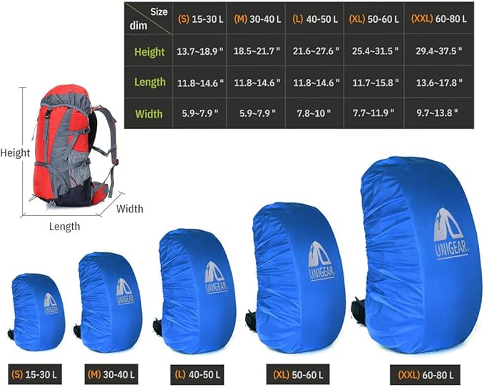 • Adjustable to Cover Your Backpack : Unigear rain cover features 2 vertical anti-slip buckle straps to adjust different backpack and pull the pack cover tight across the pack harness. Reinforce the elastic rim around your backpack to prevent sliding off. Comes in 5 sizes and colors to fit from 10L to 90L backpack