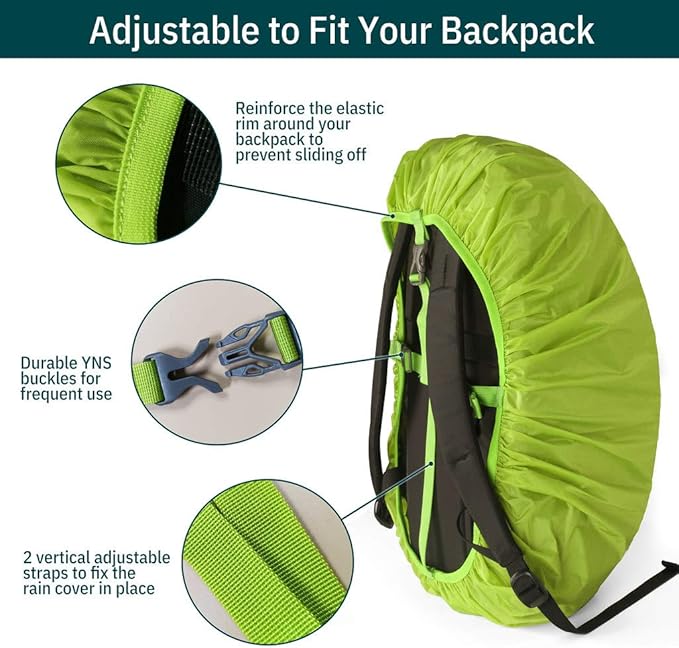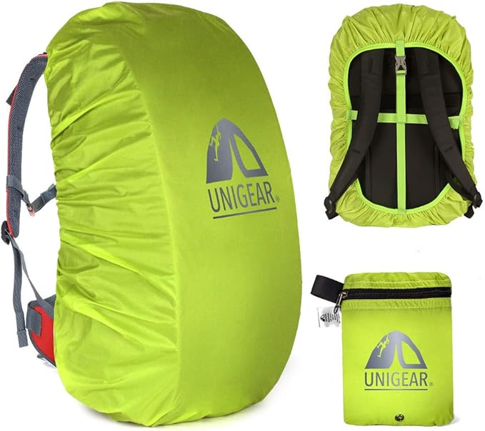 - Adjustable to Cover Your Backpack : Unigear rain cover features 2 vertical anti-slip buckle straps to adjust different backpack and pull the pack cover tight across the pack harness. Reinforce the elastic rim around your backpack to prevent sliding off. Comes in 5 sizes and colors to fit from 10L to 90L backpack