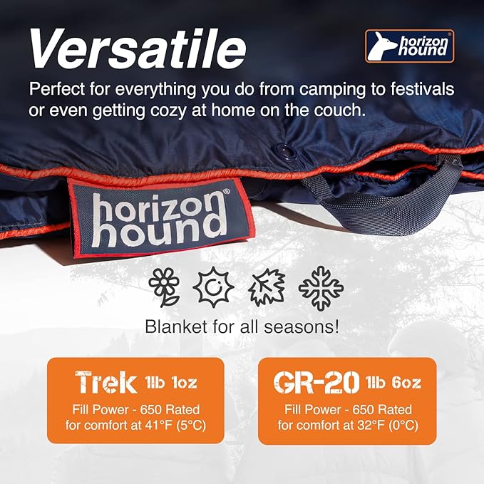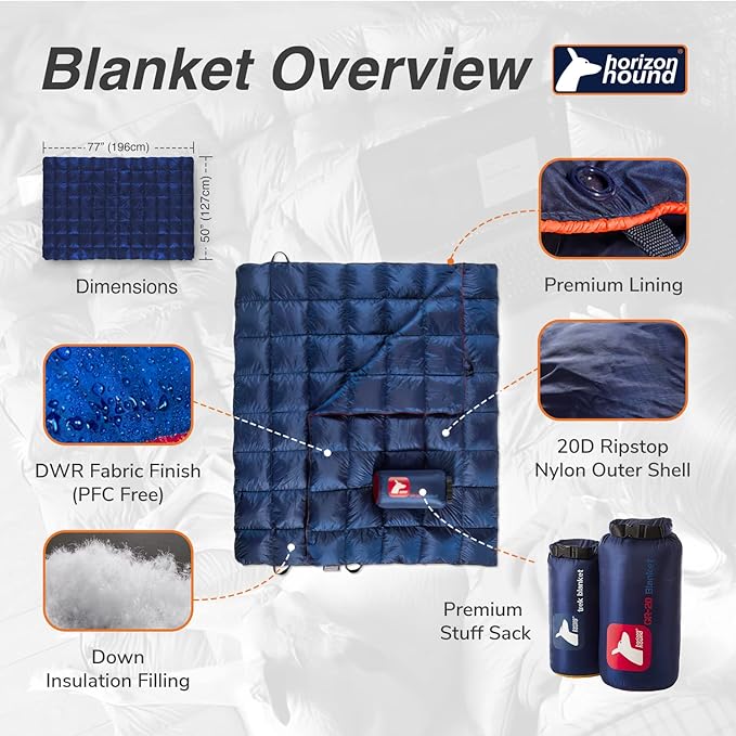 Horizon Hound Down Camping Blanket - Outdoor Travel Blanket | Sustainable Insulated Down | Lightweight & Warm Quilt for Camping, Stadium, Hiking & Festival | Water Resistant, Packable & Compact