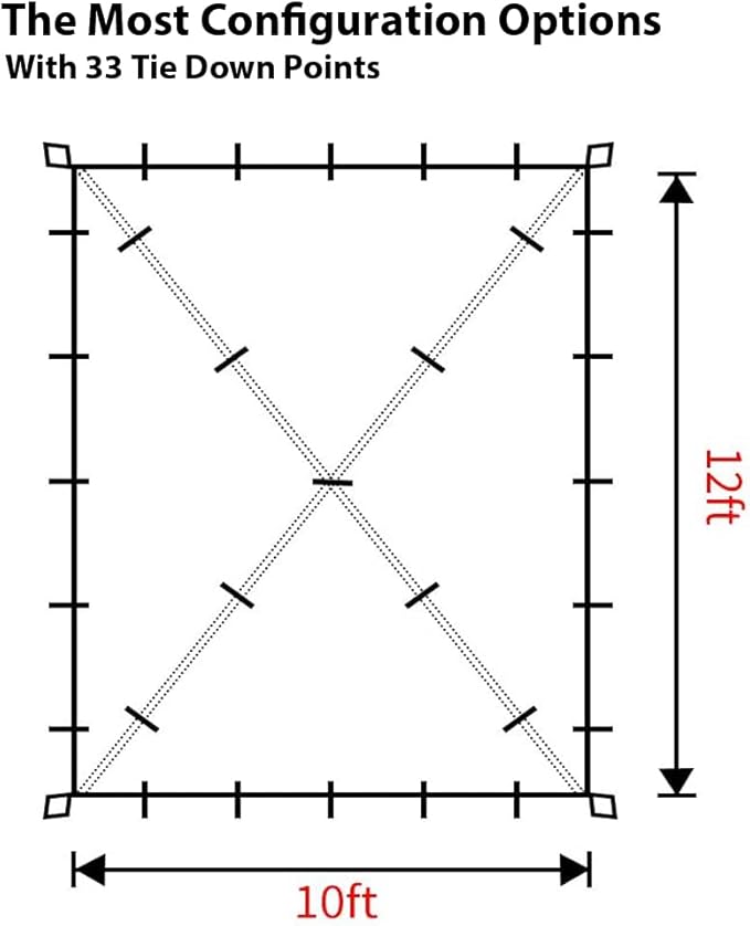 - ✔ BEST VALUE IN ONE COMPLETE PACKAGE - 2 CENTERLINES, 33 TIE DOWN POINTS, 5,000MM WATERPROOF RATING. INCLUDES STAKES, ROPES AND TENSIONERS! Choose the size that works best for you: 14ft x 12ft OR 12ft x 10ft OR 10ft x 10ft OR 10ft x 8ft