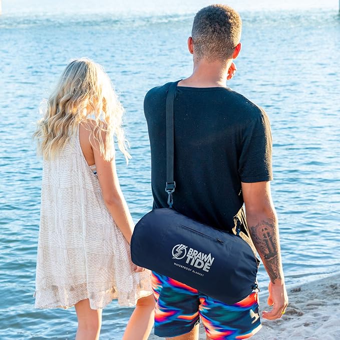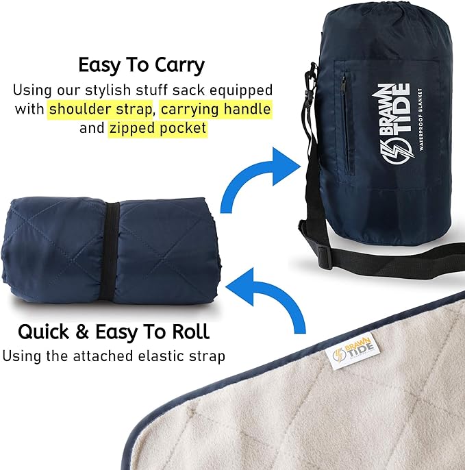 BRAWNTIDE Large Outdoor Waterproof Blanket - Quilted, Extra Thick Fleece, Warm, Windproof, Sandproof, Includes Stuff Sack, Shoulder Strap, Ideal for Beaches, Picnics, Camping, Stadiums, Dogs, Car