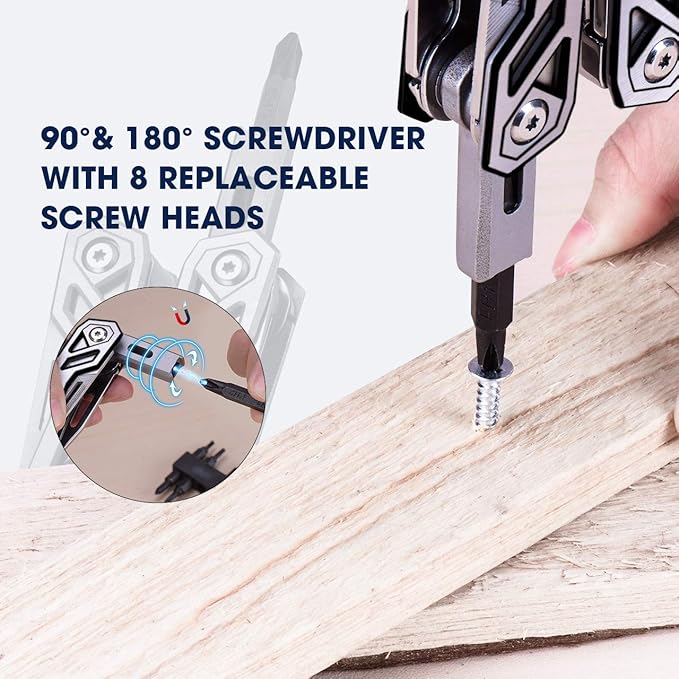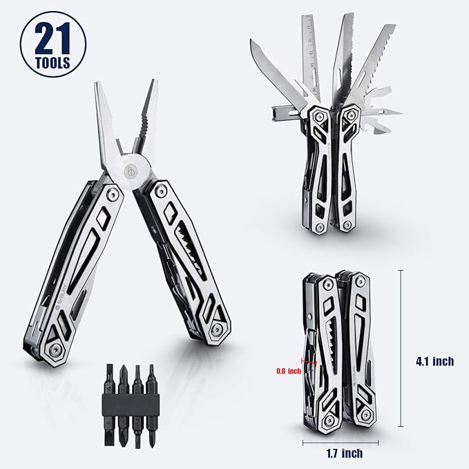 - 21 in 1 Multitool Pliers: With 21 functions including Needle-Nose Pliers, End Cutting Pliers, Combination Pliers, Hexagon Sleeve, Cutter, Scale, Sickle, Rope Cutter, Bottle Opener Screwdriver, Saw, 8-in-1 bit set, and more. It is also perfect for outdoor enthusiasts or people who like to prepare for outdoor sports