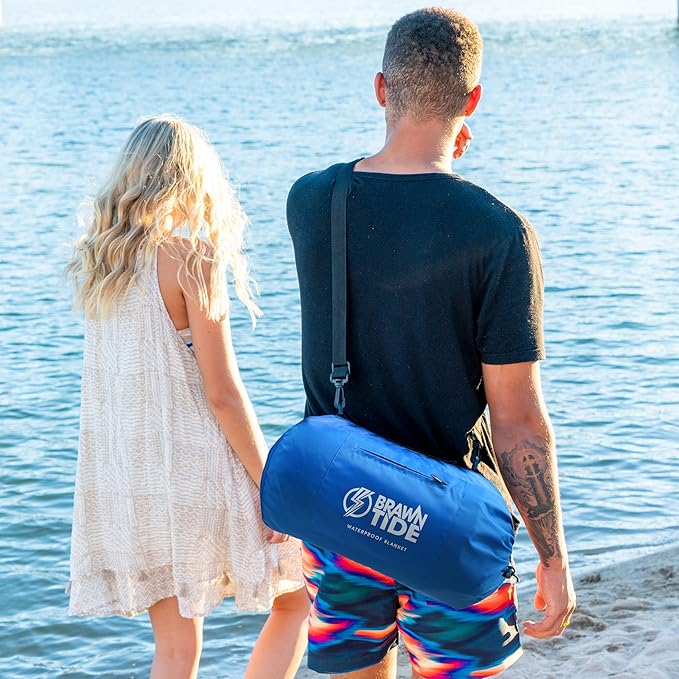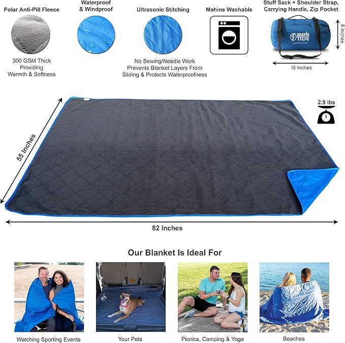 BRAWNTIDE Large Outdoor Waterproof Blanket - Quilted, Extra Thick Fleece, Warm, Windproof, Sandproof, Includes Stuff Sack, Shoulder Strap, Ideal for Beaches, Picnics, Camping, Stadiums, Dogs, Car