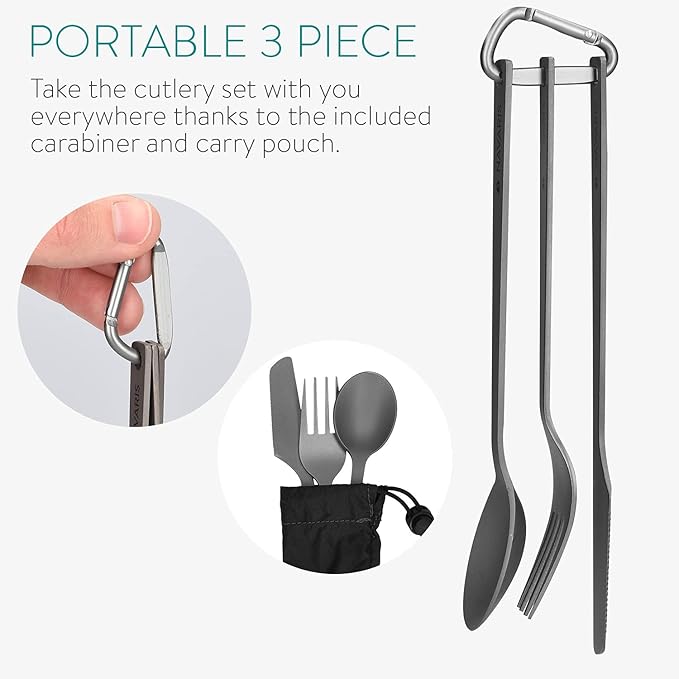 - INCLUDES: The titanium spoon (6.3"), titanium fork (6.3") and titanium knife (6.9") are conveniently kept together with the included carabiner and are easily stored and transported in the mesh bag provided.