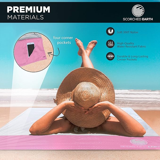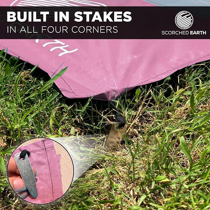 - ★ SET INCLUDES BUILT-IN STAKES, CORNER POCKETS, CARRYING BAG, CARABINER CLIP: The ScorchedEarth Pocket Blanket includes high-quality built-in metal stakes and corner pockets that can be filled with sand, so you won’t have to worry about the wind while relaxing outdoors. The set also includes a matching carrying bag and carabiner clip.