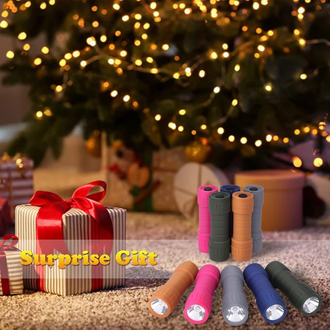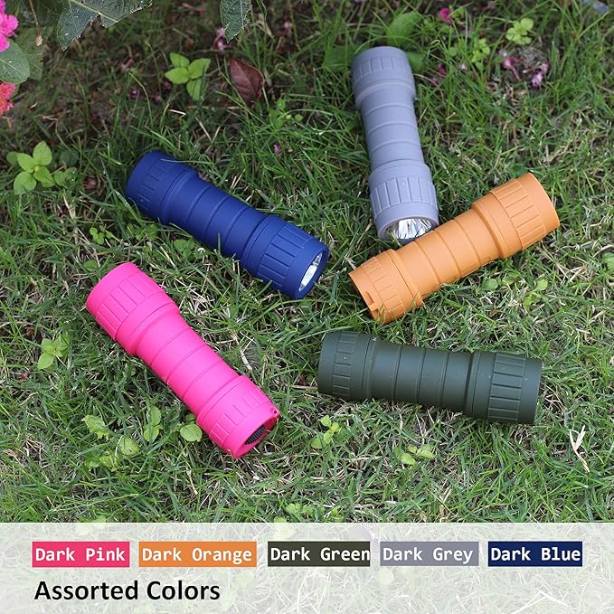 - COLOR ASSORTED AND BATTERIES INCLUDED: You will receive 6 colors assorted (Dark Silvery, Dark Green, Dark Blue, Dark Orange, Dark Pink, Dark Yellow). 3-pieces batteries are included and pre-installed inside each flashlight. Please take off the insulated sheet before use.