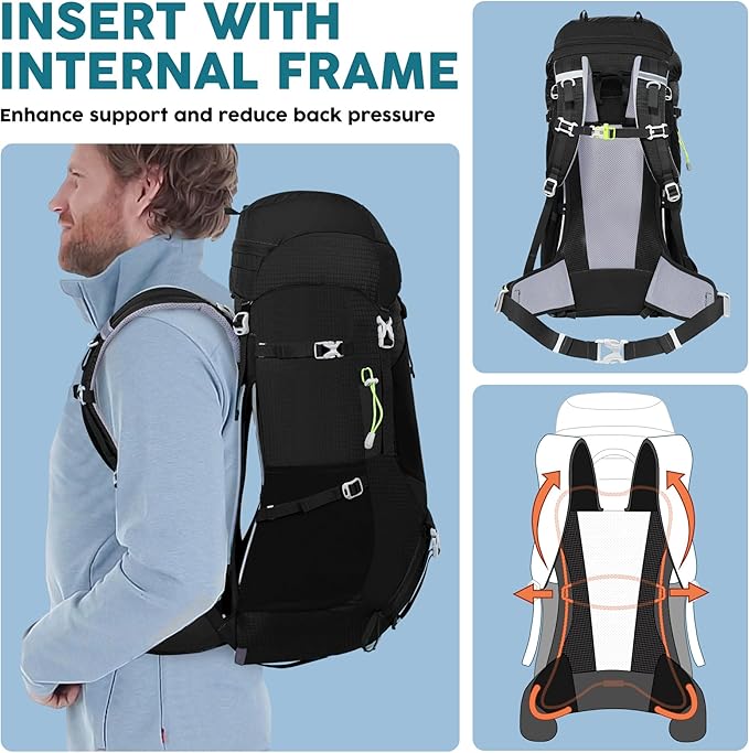 • Breathable System: The hiking backpack is well constructed with streamlined suspension system and breathable mesh padding on back, shoulder straps, hip belt for relieving fatigue and ventilation, speed up heat dissipation. Making your trips more comfortable