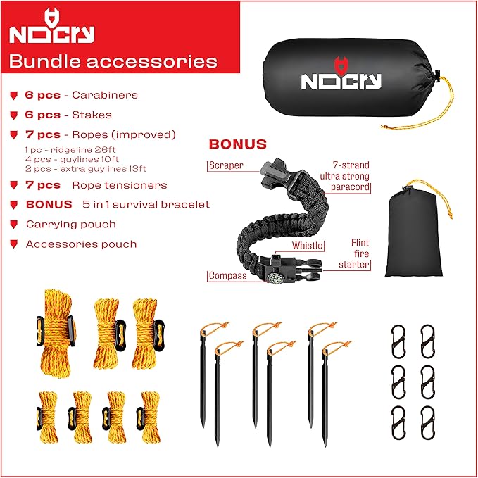 - THE GEAR YOU NEED IN ONE PLACE. Comes with 1 rainfly tarp, 6 aluminium stakes with orange reflective paracord ties, 6 carabiners, 7 adjustable ropes, 1 sack for the ropes and poles and 1 carrying pouch for all your gear. Just pack them together and put them in your bag. And, as a bonus, we’ve added a survival bracelet too!