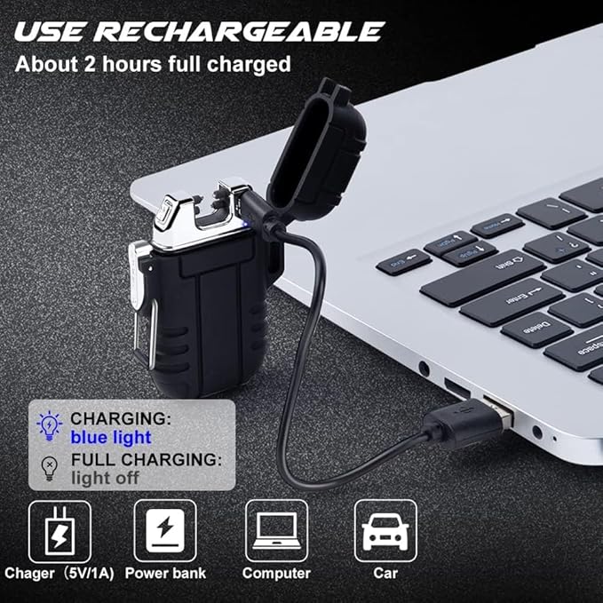 - USB RECHARGEABLE LIGHTER: the flameless dual arc lighter is powered by a rechargeable lithium battery, usb rechargeable electronic lighter, about 2 hours full charged. No gas or butane required, no more refilling, convenient and easy to use