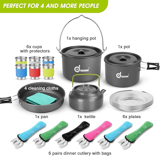 Odoland 39pcs Camping Cookware Mess Kit, Non-Stick Large Size Hanging Pot Pan Kettle with Base Dinner Cutlery Sets for 6 and More, Cups Dishes Forks Spoons Kit for Outdoor Camping Hiking Picnic