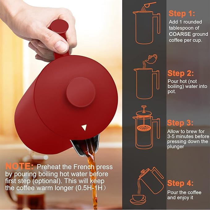 - Perfect Brew & Stay Hot:34 OZ Large capacity double-wall stainless steel french press coffee maker will keep your coffee hot for 60 minutes longer than other steel and glass models. Turn the symbol (▲ ) away from the spout for superior thermal retention. Take your time and enjoy delicious coffee