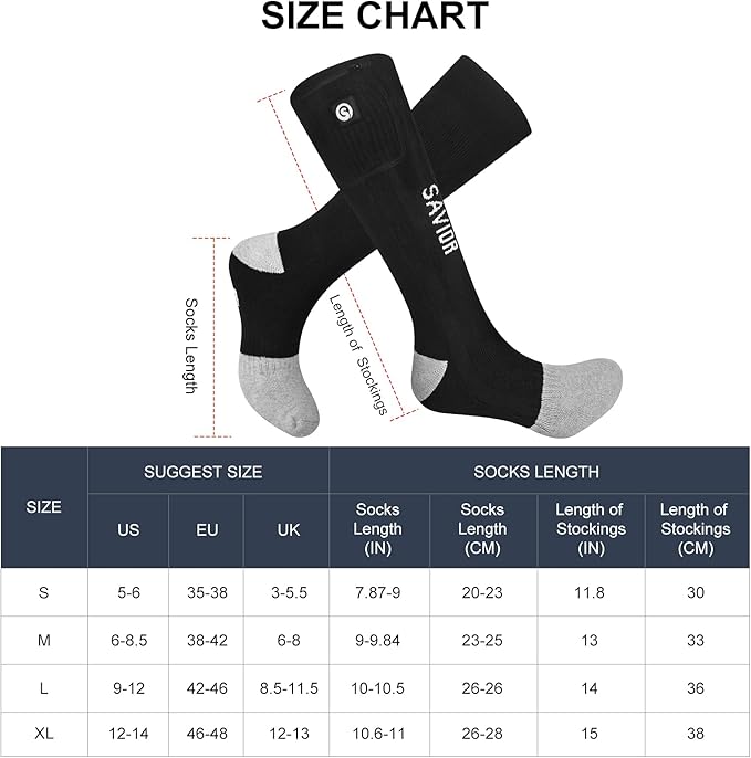 - 【Quality Imported Material】This winter socks have long life work time with 7.4V 2200MAH Li-ion rechargeable battery.Imported heating elements and quality material.It can keep you warm all day (especially for chronically cold feet), Dual cable charging system for the batteries to charge at the same time, the ease of removing batteries. Long-lasting heating, long life batteries, no longer afraid of the cold.