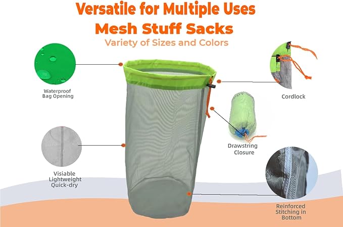 - 【Durable Construction】 –Multi-filament nylon mesh for high strength tear resistance. Reinforced stitching ensures structural stability and long-term durability. Combines a cord lock and drawstring knot to lock contents safely inside and prevent accidental opening.