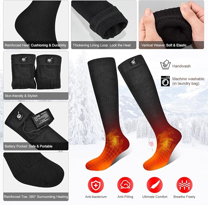 - 【Heating Elements Covers Instep and Toes Area】Upgraded heated socks to use fiber heating elements all around both fore foot and instep. Great for cold feet.Give you a warm winter!