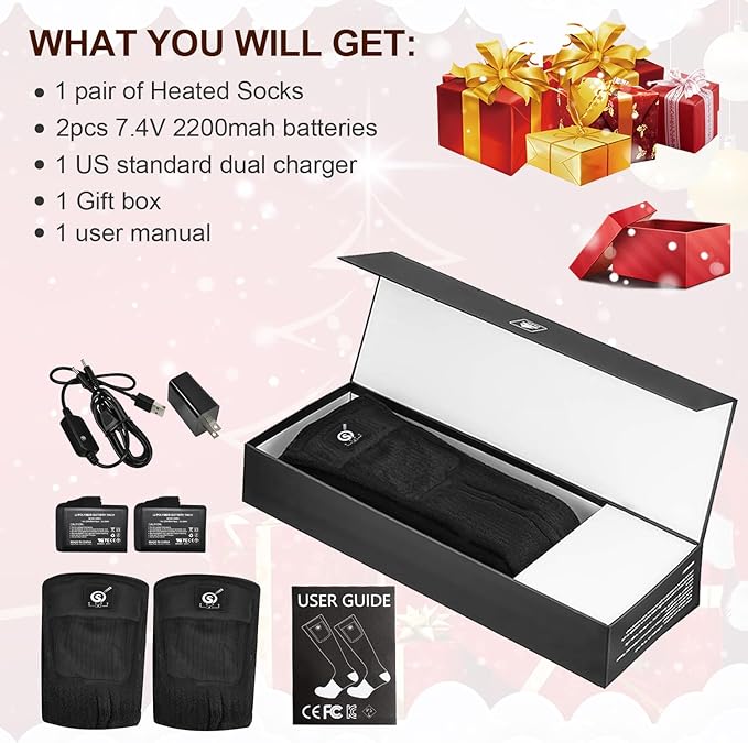- 【7.4v 2200mah Batteries&3 Settings Temperature Controller】Battery socks powered by with 7.4V 2200mah rechargeable lithium battery packs,full charge around 3-4 hours,duration 3 - 8hours with 3 heat setting. controller LED red is for high temperature,white for medium temperature,blue for low temperature.you can easily adjust the temperature.