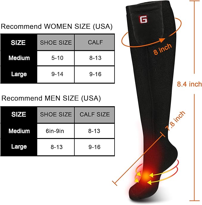 - 🔥🔥🔥 COZY THERMAL FOOT WARMER: This heat warmer socks are made of thick cotton and spandex. They're soft, breathable, warm and comfy. These cozy crew socks actually provide a lot of warmth just by themselves, even no battery. 2 sizes suitable for most American men and women, these electric heated elastic socks are the best gifts for you in cold days.