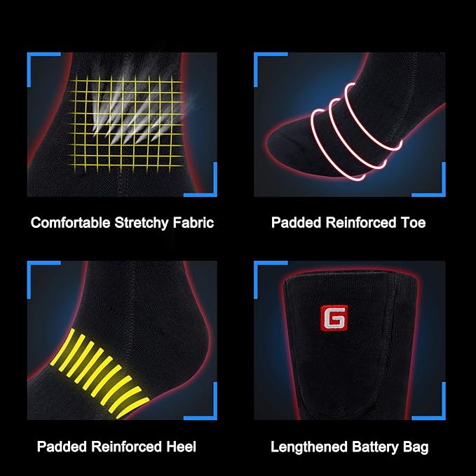- 🔥🔥🔥ELECTRIC HEATING SOCKS TIPS: When the battery are fully charged, the The indicator on Charger instead of battery light will turn red to green. Hand wash only, remember to remove the battery before washing. The heating socks will stimulate your blood circulation for your feet. No more cold feet in winter! If you have any questions about your order, please feel free to contact us by email, we will help you to solve it ASAP. The heated socks warm your feet, our service warms your heart.