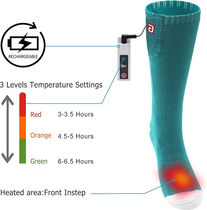 - 🔥🔥🔥 【3 HEAT SETTINGS】The heated socks are designed with 3 heat settings, including high heat(Red Light: 3-3.5 hours), medium heat(Orange Light, 4.5-5 hours), and low heat(Green Light, 6-6.5 hours) make these electric heated socks ideal for outdoor sports and working outside. Rechargeable heated socks are equipped with 2pcs 2200mAh Large Capacity Battery, providing you with enduring warmth.