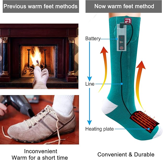 - 🔥🔥🔥 【HEATING FOOT BOTTOM IMMEDIATELY】These heated thermal socks heat up within 1 minutes. The heating area is front instep.The temperature up to 120 °F to warm your cold feet in cold weather. Fit for winter outdoor activities such as hiking, cycling, hunting, ice fishing, camping, travelling etc.