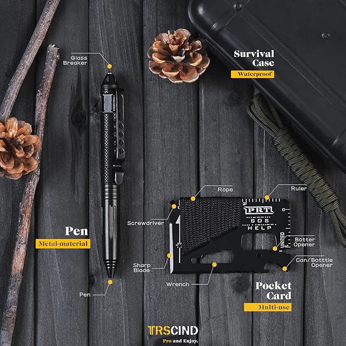 - PROFESSIONAL SURVIVAL KIT: Includes a flashlight, fire starter, wire saw, multi-functional card, bracelet, bottle clip, tungsten pen, and emergency blanket. With over 1000 combined uses, it’s a compact, smart survival kit for camping and hunting