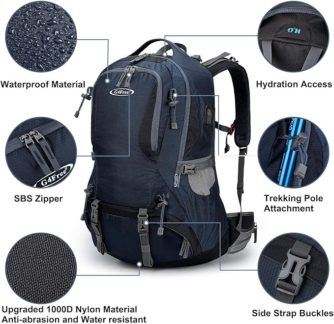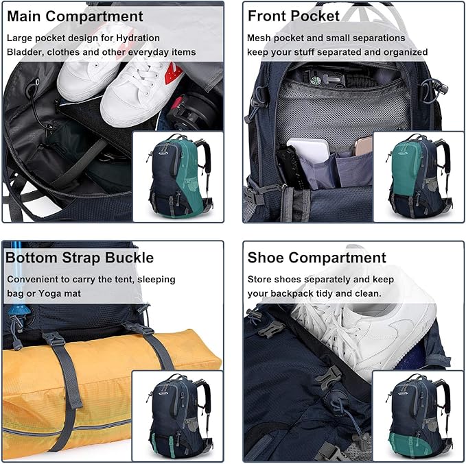 - MANY POCKETS: One Large Front Zipper Pocket for quick access and one large deep main pocket as well as one SPECIAL ZIPPER POCKET for shoes or dirty clothes. There also comes with 1 bottom rain cover pocket INCLUDE RAIN COVER. 2 Hipbelt Pockets could accommodate cell phone/MP3 player and 2 Side Pockets for bottles or umbrella.