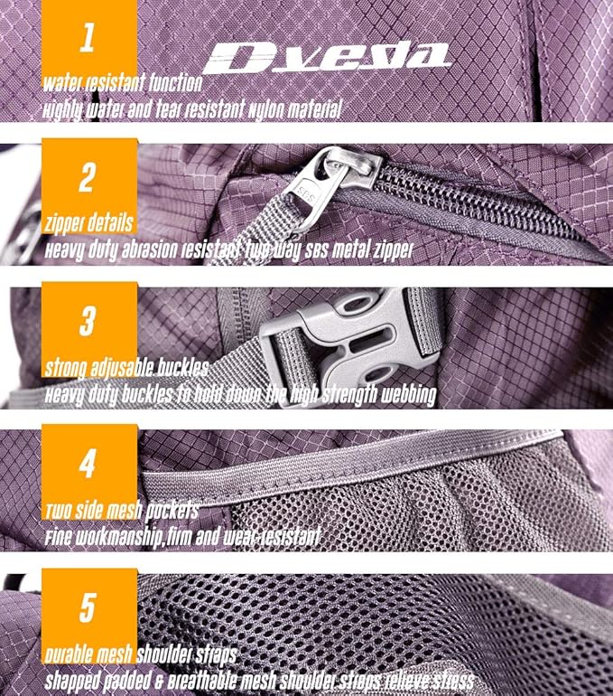 • 🚵★ Enjoying Your Hiking Backpack★ :Dveda 35L hiking backpack ideal for Disney day trip, day travel, overnight trip, camping, day hiking and vocation. Great hiking backpack for women and men. Its rip-resistant nylon construction sheds rain and resists wear better than cheaper polyester. Our Products have 24 moths Replacement Service and 100% Satisfaction, If you are not Satisfied with your Purchase for Any Reason, Please Feel Free To Contact Us.