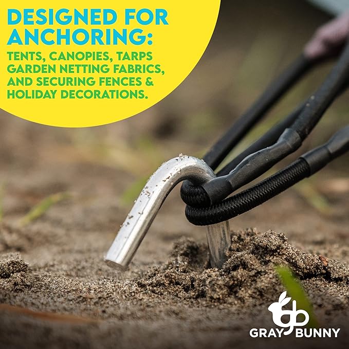- MULTI-FUNCTIONAL: Designed for anchoring camping tents, canopies, tarp, and garden netting and fabrics. Can also be used for landscaping, and securing fences. Create shelter to cover and protect flowers and vegetables from deer and other pesky animals. Great for securing outdoor holiday decorations.