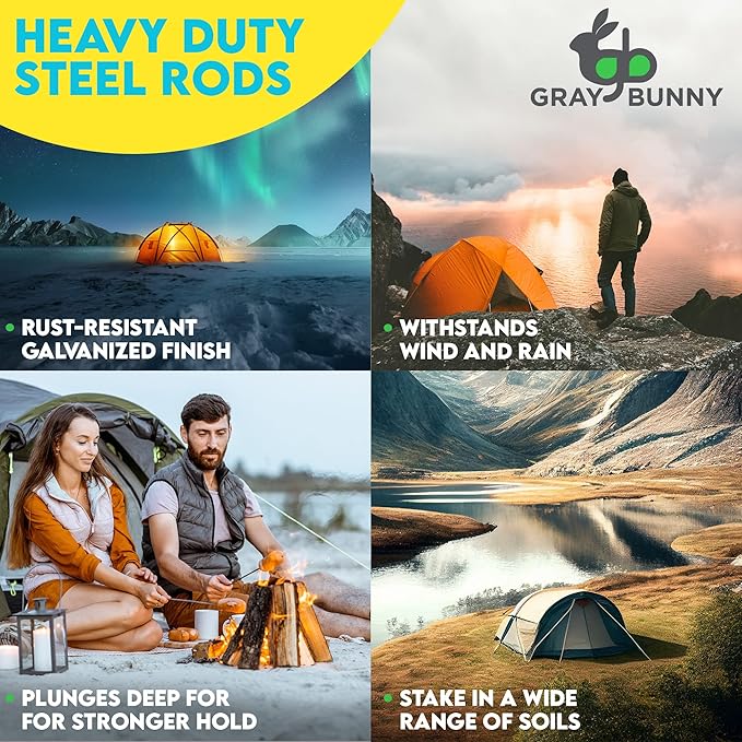 - STURDY AND DURABLE: Lightweight steel tent stakes are strong enough to withstand wind and rain. Stay firmly in place to keep you safe in a wide range of soil conditions. Sleep soundly knowing your tent is secured.