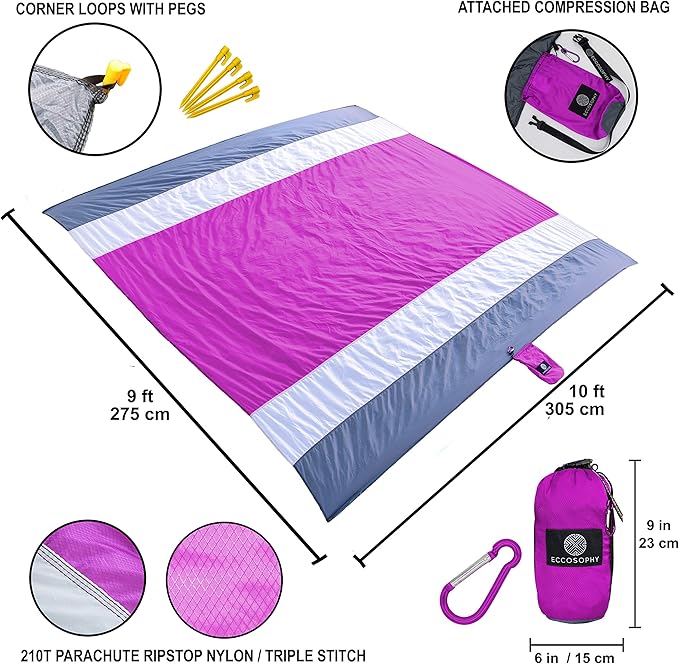 ECCOSOPHY Sandproof Beach Blanket - Oversized Sand Free Beach Mat 9'x10' - Lightweight Outdoor Picnic Blanket Anchored with 4 Corner Sand Pockets & Plastic Stakes - Heat Proof, Quick Drying & Compact