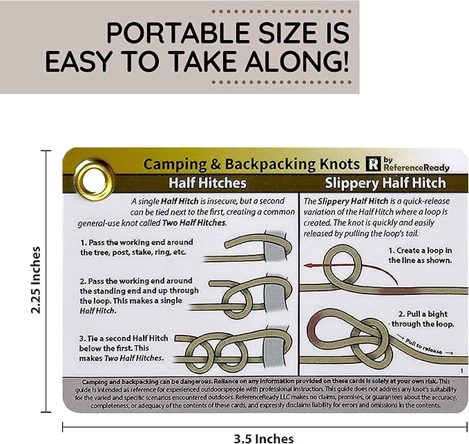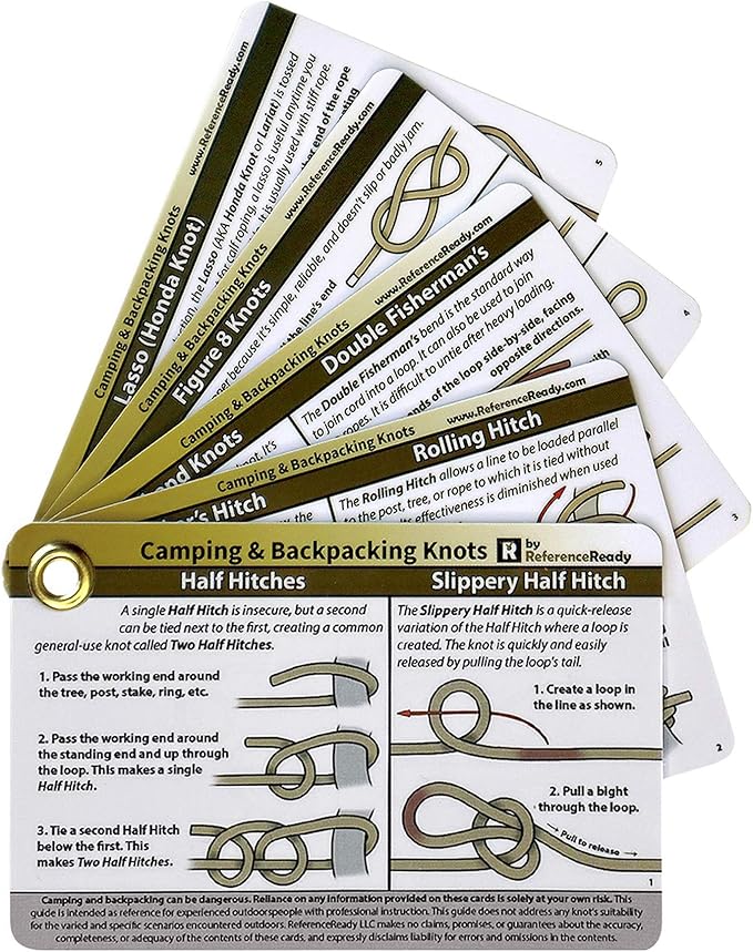 - Knot cards with step-by-step, color-coded knot tying diagrams designed to be easy to follow, including descriptions and usage tips