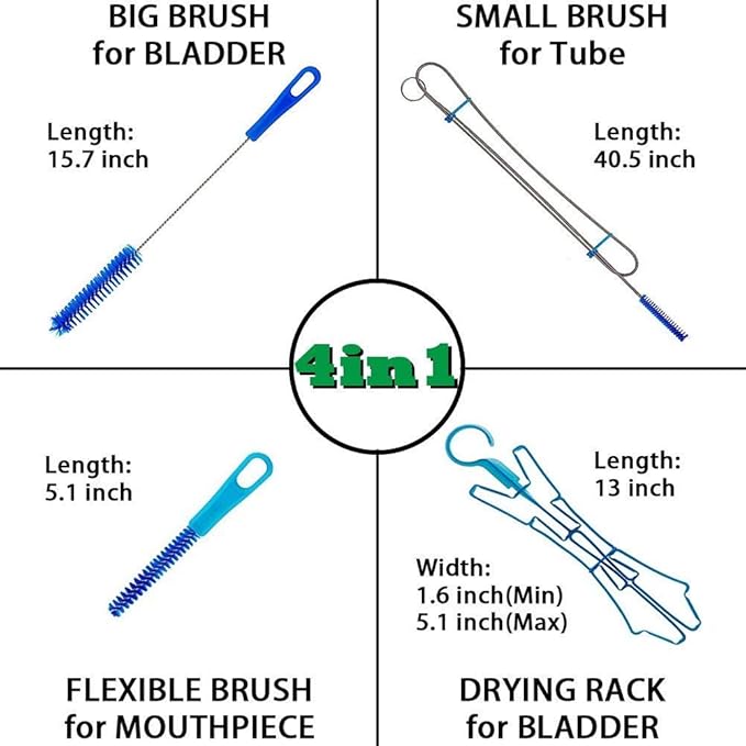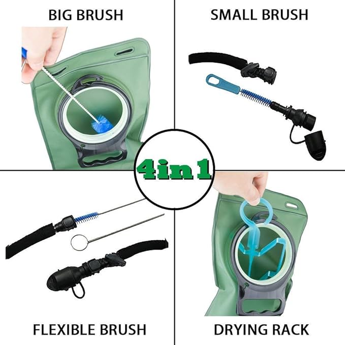 - 4pcs hydration cleaning kit includes 1 x FLEXIBLE tube brush, 1 x BIGGER bladder brush 1 x SMALLER bite valve brush and 1 x COLLAPSIBLE drying hanger rack.