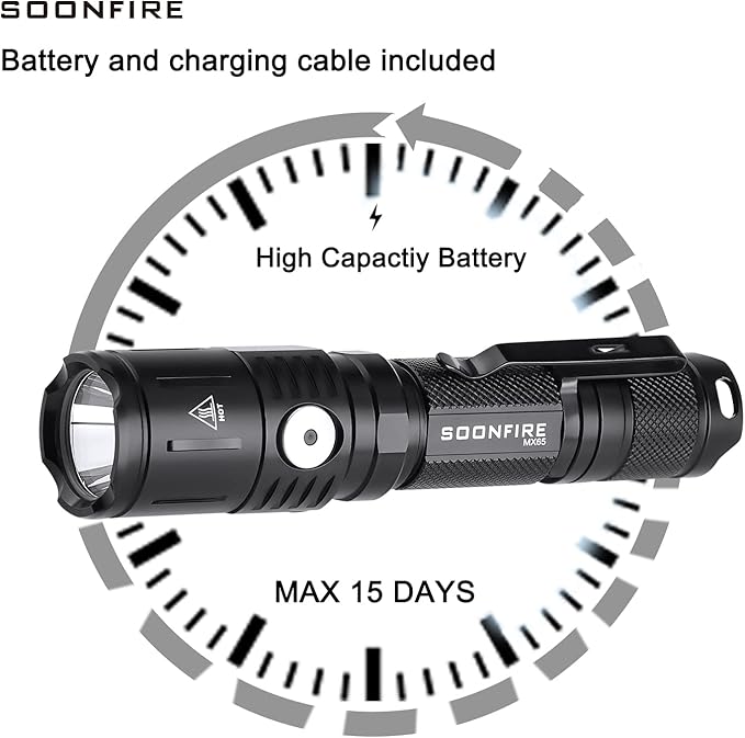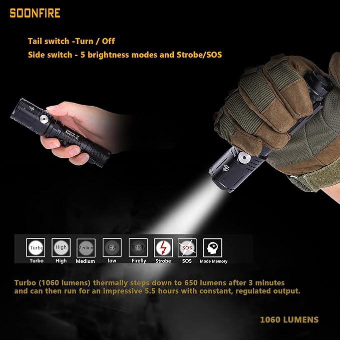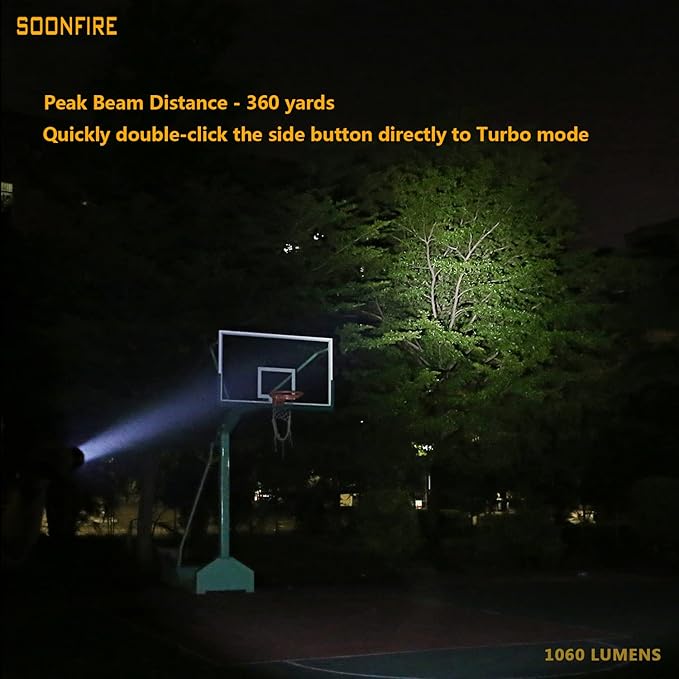 - SUPER BRIGHT - The flashlight delivers a maximum output of 1060 lumens output with 360 yards throw,Offers 1.5 solid hour at 1060 lumens or switch to 8 lumen low mode for up to 300 hours of light.