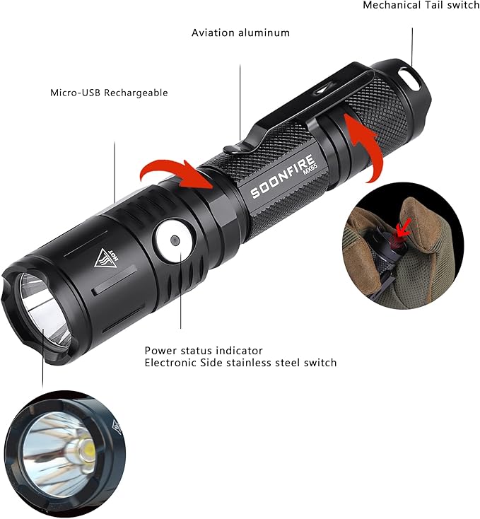 - EASY TO OPERATE - Tail switch and Side stainless steel switch for Various Mode (Low-Mid-High-Strobe-Flash-SOS), Memorized Function Ability,Perfect for tactical, search & rescue, law enforcement, inspection, emergencies and more.