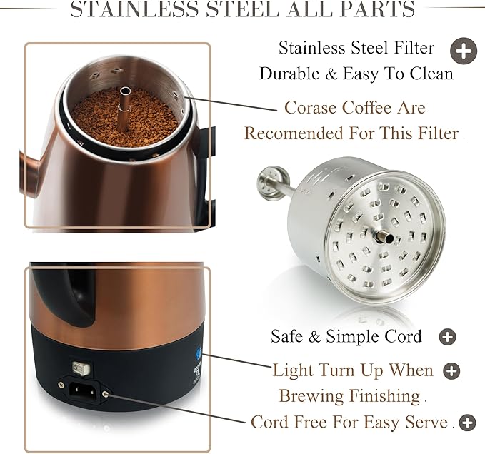 - Stylish Design: The electric percolator coffee pot is made of durable, shiny stainless steel with a black cool touch handle, PC knob, ready-to-serve indicator light, and automatic keep-warm function to keep the coffee hot.