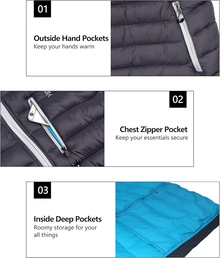 - MULTIPLE CONVENIENT POCKETS: 2 zippered hand warmer pockets, 1 zippered chest pockets and 2 inside deep pockets, great for keys, phone, wallet secure