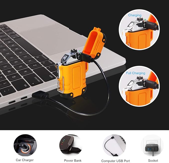 - USB rechargeable:Simply connect the Green Vivid waterproof lighter to any powered USB port,then USB cable allow the ligher be charged anywhere.After 2hrs charging,the ligher could last up to a week or 100-300 usage.And,dual arc technology design,makes superior firepower to ignite.