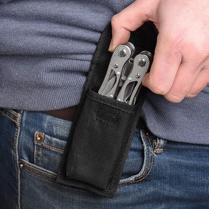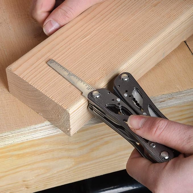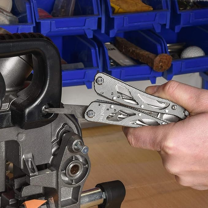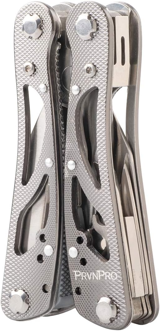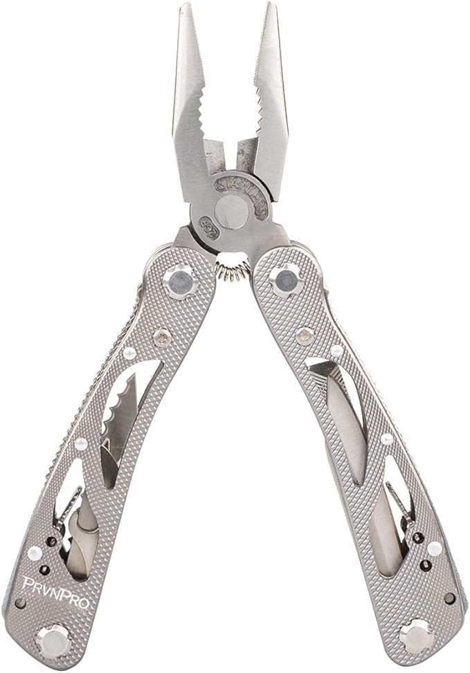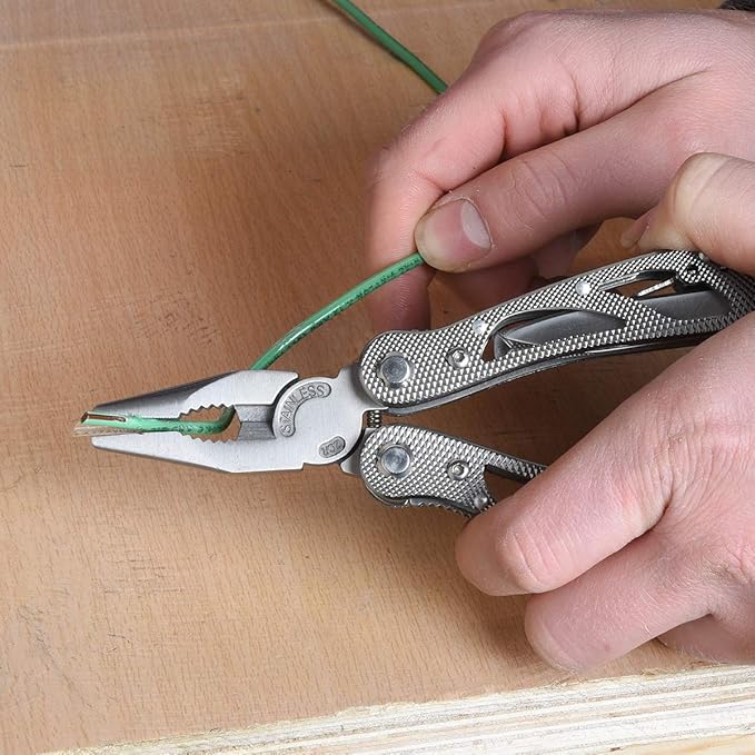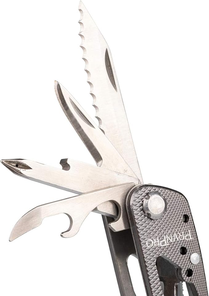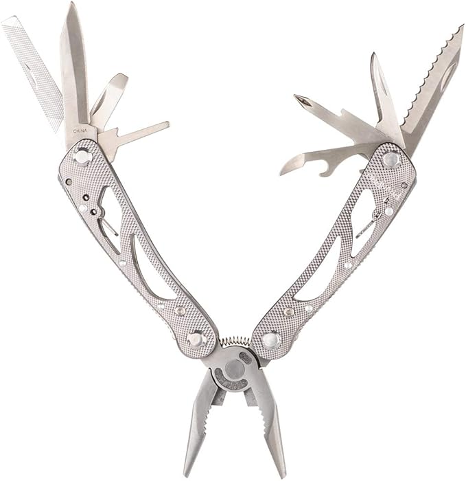 - 14-in-1 multi-tool includes: needle nose plier, stripper, wire cutter, bottle opener, can opener, phillips screwdriver, small blade, serrated blade, blade, small flat screwdriver, big flat screwdriver, coarse file, fine fine, and hook remover.