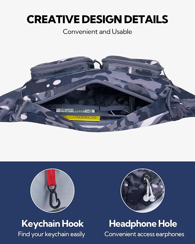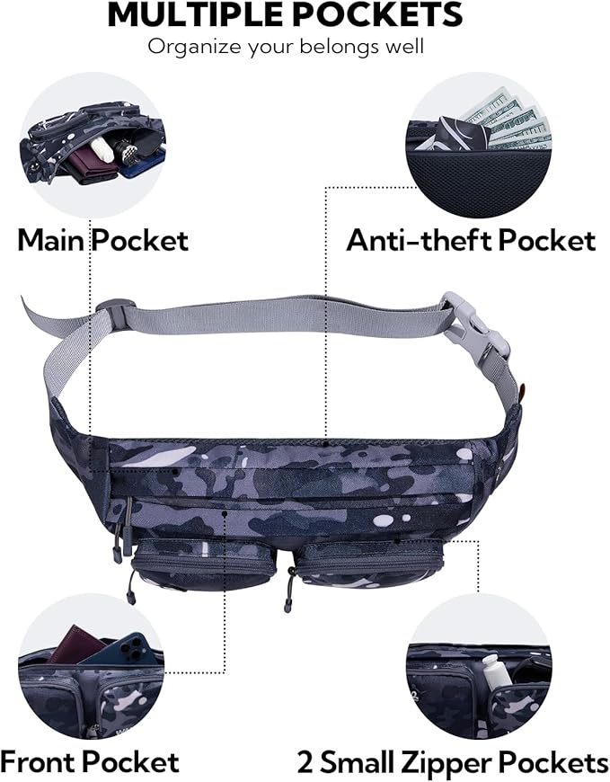 - Multiple Compartments and Anti-theft Back Pocket: This waist pack features 5 zipper pockets, providing ample space for your daily essentials. The two front pockets are designed for convenient access to small items. Additionally, the hidden theft-proof zipper pocket safeguards your valuables from potential theft