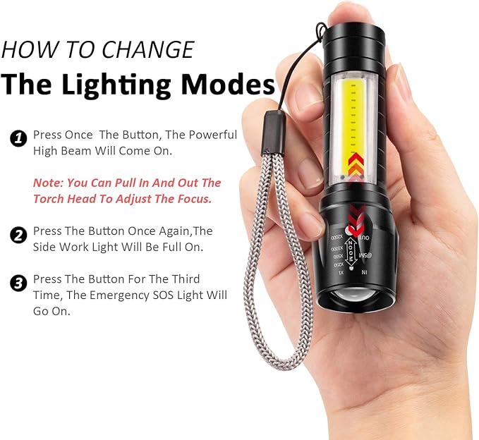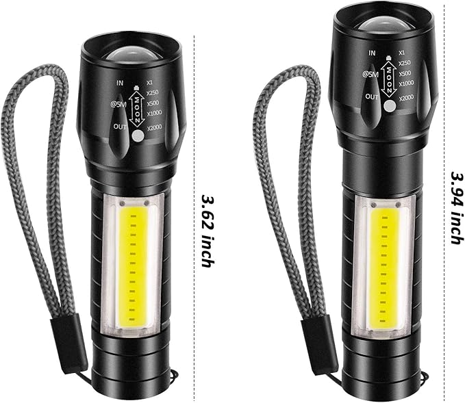 - 3 Modes: led flashlight with 3 modes, highlight, light flash, side cob light, use for long distance observation or large area illumination