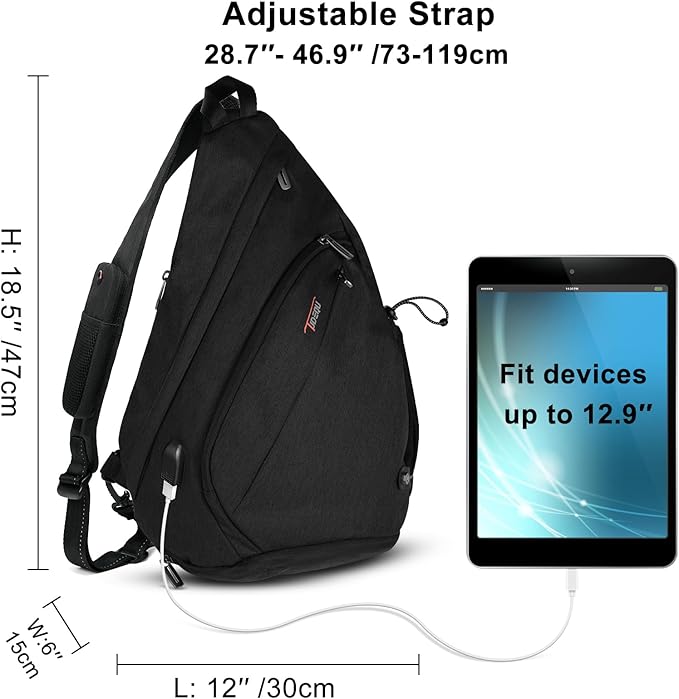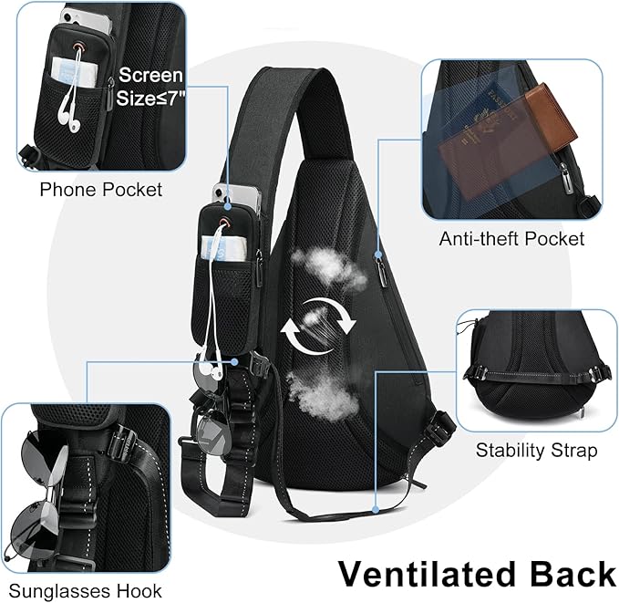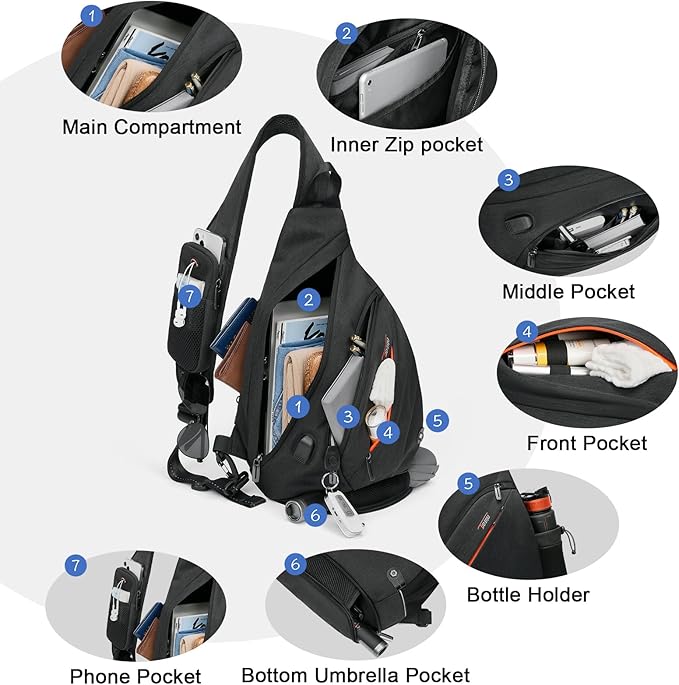 - ★ EARPHONE HOLE & USB CHARGING PORT - Phone pocket with headphone hole on hiking one strap backpack for men for easy listening. Plus, the USB charging port (note: power bank NOT included) of Single Strap Backpack for Menmakes it easy to keep your devices powered up while you're on the move.