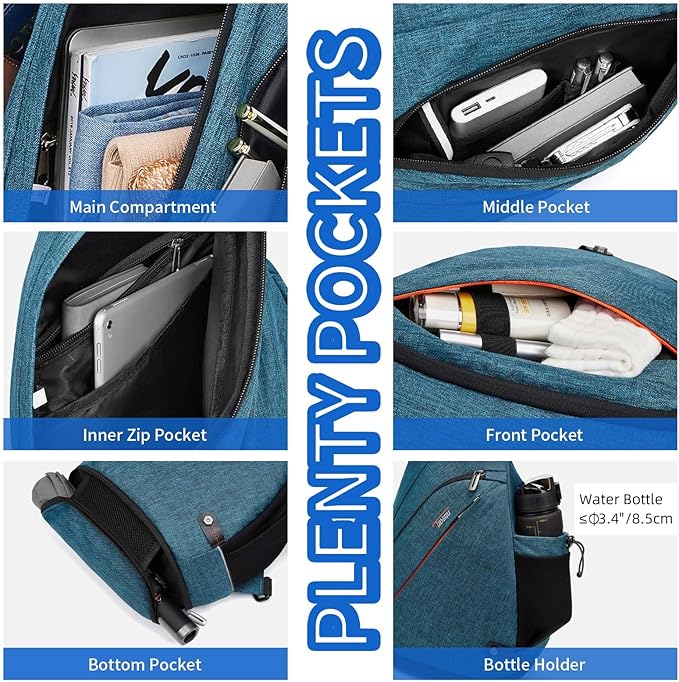 • ★ 19L & 8 SPACIOUS POCKETS - This large travel single srap backpack for men boasts 8 convenient storage pockets. The main compartment of sling backpack easily fits a tablet or iPad up to 12”. The bottle holder of the single strap sling backpack can accommodate water bottles up to a diameter of 3 3/8 inches (8.5cm). Secure your valuables in the back anti-theft pocket of the large sling bag, and the cell phone strap pocket (L×W×H=7.1”x 3.3”x 0.9”or 18×8.5×2.2cm)fits most plus-sized smartphones.