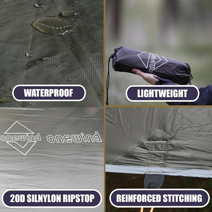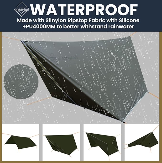 - 4000mm Waterproof Rate. Made with 1.1oz 20D high-strength ripstop silnylon, Onewind Camping Tarp is strong, durable, rainproof, windproof snowproof and more UV-resistant than 210T polyester. It also features PU 4000mm coating on inner face and silicone coating on outer face to make the rain slide down faster.
