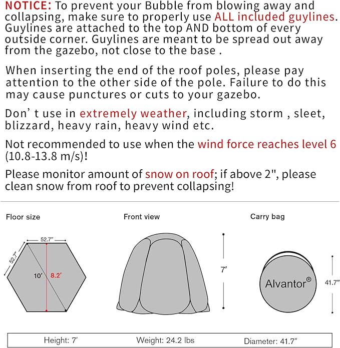 - SPACIOUS AND WARM: Alvantor big bubble gazebo provides a spacious interior shelter that comfortably fits between four and six adults. Enough room to place various pieces of furniture so you can give your bubble tent a homely feeling. The six, transparent PVC windows provide 360° view of your surroundings, whilst the inside of your bubble tent stays warm thanks to the excellent heat retention.