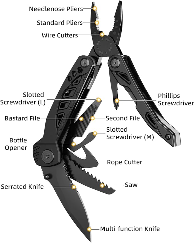 - 【Superior Quality Survival Multitool】Made of high-quality stainless steel with sufficient hardness and toughness, black oxidation treatment of the main part makes multi tool knife rust-proof and anti-corrosion. Multitool pocket knife is strong and durable that can cut, twist the screw, open fire hydrant, saw wood, open the bottle easily, etc.
