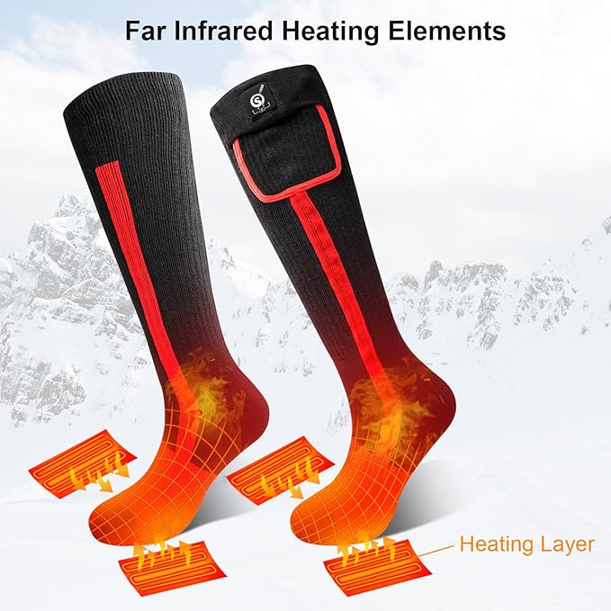 - 【Heating Elements Covers Instep and Toes Area】Upgraded heated socks to use fiber heating elements all around both fore foot and instep. Great for cold feet.Give you a warm winter!