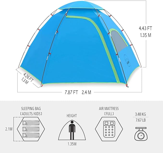 - ✔KAZOO family camping tent provides excellent convenience with an affordable price. This family camping tent has a spacious room (82 x82 x53inch) and two zippered doors to make it perfect as a family tent. One person could easily set up in 3 minutes. It provides protection from the sun, rain and wind for all outdoor activities. It is ideal to be used as a family beach tent or camping tent.