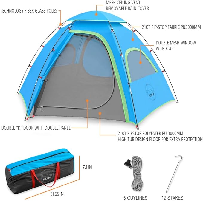 - ✔KAZOO focuses on every detail to make the best tents for various purposes such as camping, hiking, fishing, surfing, outdoor BBQ, adventure, family parties and field trips. The high quality details include but not limited to smooth and reliable SBS dual zippers, mesh interior pockets, incredibly durable rip-stop fabric materials, full-coverage rainfly and firm lightweight structure, to stand up to your biggest adventures.