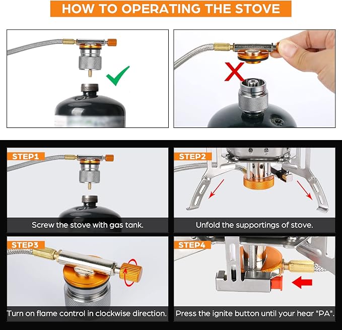 - ALL-in-1 Design: Aluminum alloy and stainless steel, equipped with piezo ignition system and flame controller, make it more convenience and practicable. Equipped with 2 kinds of connector, perfect for different gas tanks. Compatible with any 7/16 thread single protane/butane-propane mixed fuel canisters (EN 417).
