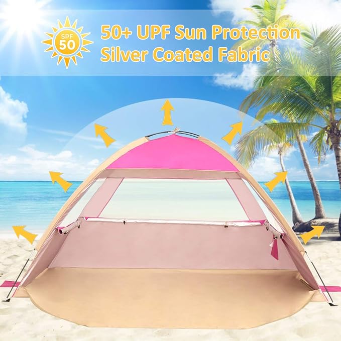- Updated Material: Venustas beach canopy has premium 190T Special silver coated polyester fabric, 4 layers of fabric to achieve UV protection, shading, and heat insulation. 4-sided ventilation design providing excellent ventilation. The floor extends 40 inches for an extra activity room. 3 curtains protect your privacy.